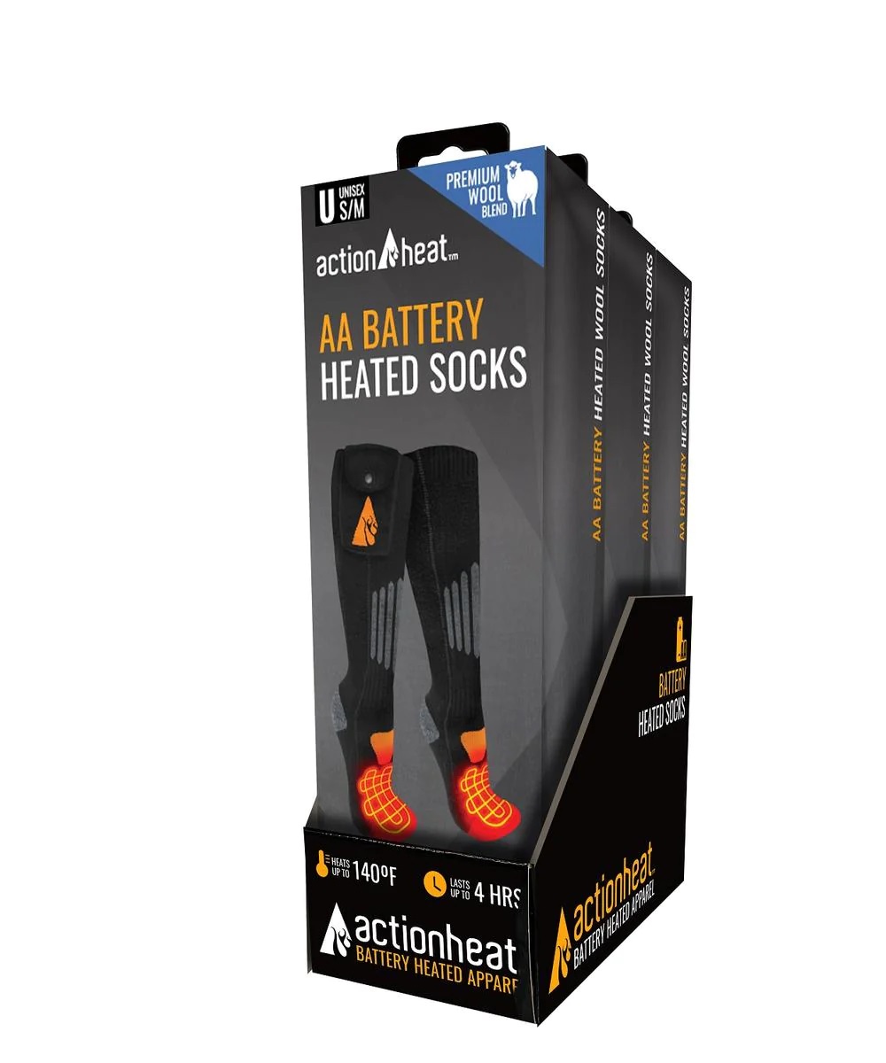 The ActionHeat battery heated socks are the perfect blend of quality and comfort. The ActionHeat socks reach a maximum temperature of 130F and can last up to 4 hours. ActionHeat battery heated apparel utilizes innovative technology designed to warm the core body temperature. These revolutionary garments feature built-in heating panels and are made with ActionFlex material that provides lightweight warmth, comfort, and versatility.ActionHeat heated garments use FAR infrared heating and ActionWave heat reflective technology to deliver hours of heat and comfort. ActionHeat allows you to stay warmer and enjoy outdoor winter activities longer than ever before. Estimated Heating Times:Heats up to 130F for up to 4+ hours.