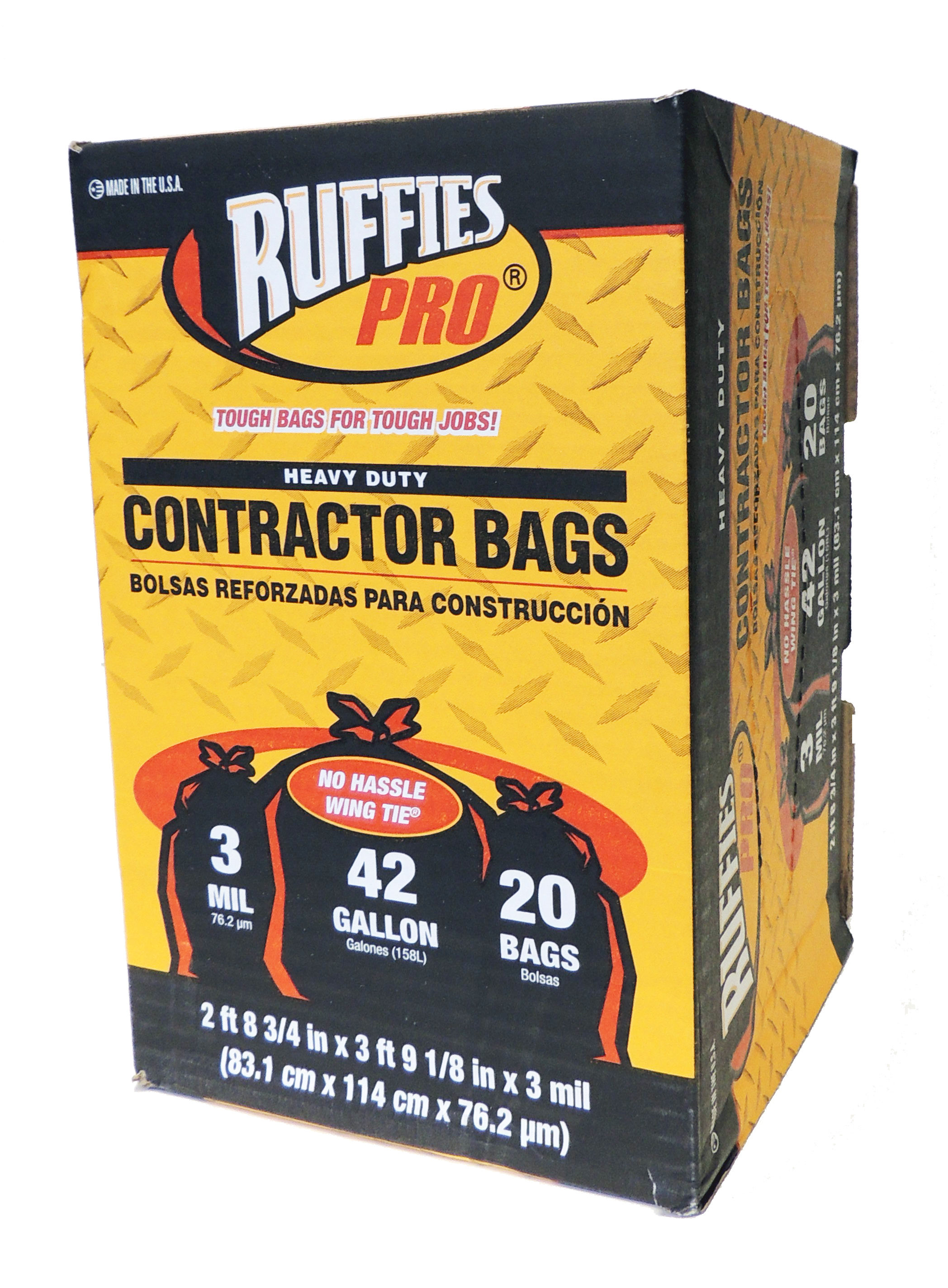Product Description Ruffies Pro trash bags are designed specifically for dealers who want high quality, extra tough bags; packaging features bold graphics to create dominant shelf presence and easy product identification; 3 mil heavy duty