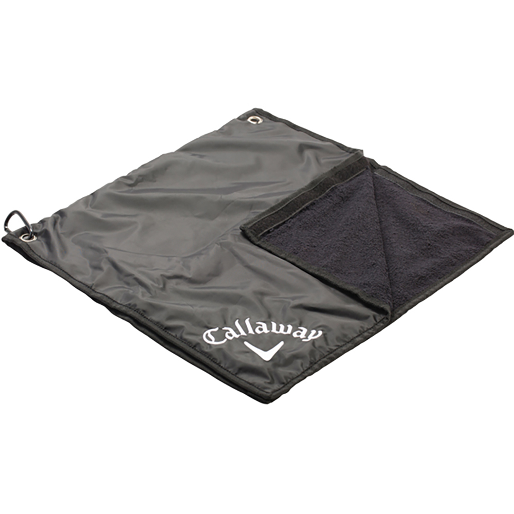 The innovative callaway rain hood golf towel delivers 2-in-1 value and convenience. The outer rain hood shell is constructed of waterproof nylon, while the inside towel is made of microfiber cotton for optimal club cleaning capability. Hang the callaway rain hood golf towel off your golf bag using the provided carabiner for convenient cleaning access during your round, and when bad weather approaches, simply detach and slip it over the top of your golf bag to keep your clubs and grips dry. When used as a rain hood, the sides provide easy access to clubs.