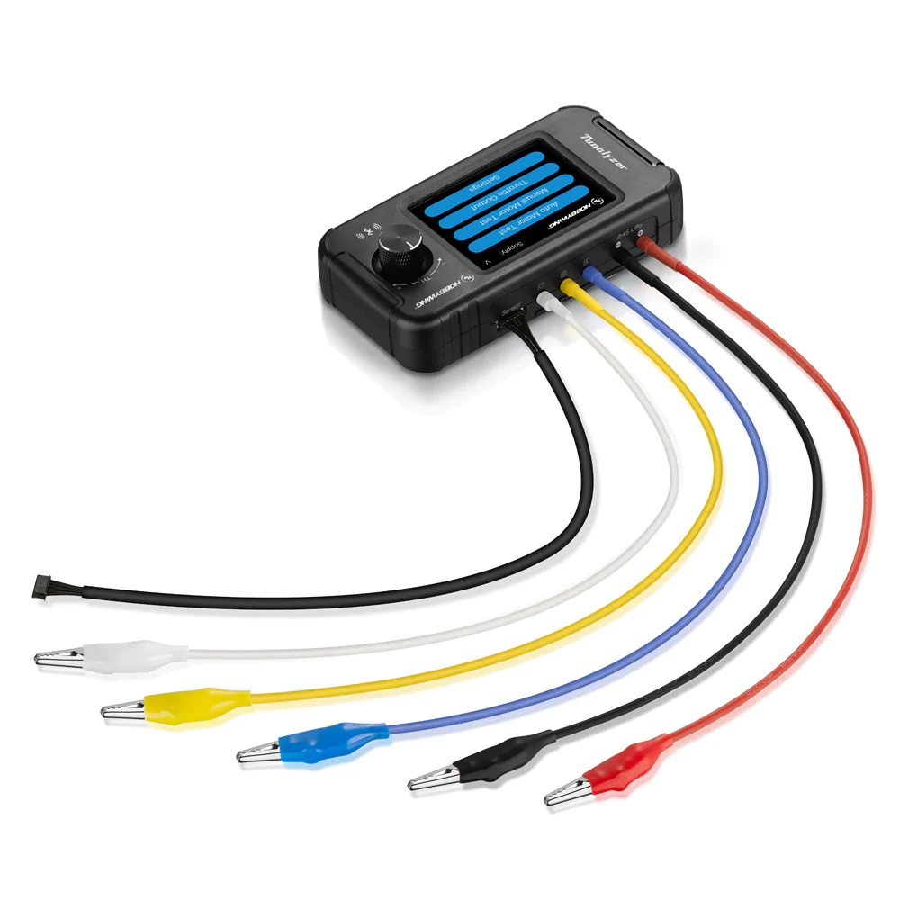 Tunalyzer is used to test the brushless DC motor and its internal components. It can measure the Kv value, rpm, current, end-bell timing, and sensor elements of the brushless motor. These parameters can be displayed on the LCD in real time so that you can have an intuitive and full understanding of the motor used.In addition, the built-in Bluetooth of the Tunalyzer can establish communication with your HOBBYWING ESC through the mobile phone app to realize the parameter setting and firmware updating of the ESCFeatures:Consistent, reliable, and accurate testing results: 8 different auto-test parameters, 4 different manual test parametersAutomatic Test Mode: The Tunalyzer allows you to run auto-testing modes to provide quick and easy tests.Stable Voltage Regulator: The Tunalyzer has an internal voltage regulator to allow repeated tests at the same voltage as the battery pack discharges. This allows testing to be done on several motors for direct comparisons.Manual Test Mode: The Tunalyzer can be used as a manual tester for simple benchtop checks. Forward and reverse with 100% linear throttle. The live output of the data is displayed as well.Multi-Function Control Dial: The dial on the face of the Tunalyzer is used for throttle control as well as external testing. PWM output is offered for use to test Servos and ESCs on the bench.RPM Displayed in Real Time: The Tunalyzer provides a motor pole setting from 2-60 pole motors. This allows for an accurate and precise display of motor RPM in real-time.3-inch Color Touch Screen Display: Ultra crisp and clear full-color touch display allow for an extremely quick and easy-to-learn interface. Easy to read and use.OTA Tuning and Upgrades: The Tunalyzer can double as your ESC programmer device for simple benchtop ESC tuning. With the HW Link App, your favorite smart device can be used to connect via Bluetooth to the Tunalyzer.Multiple motor types supported: Sensorless and Sensor motors can be tested. Virtually any pole count or