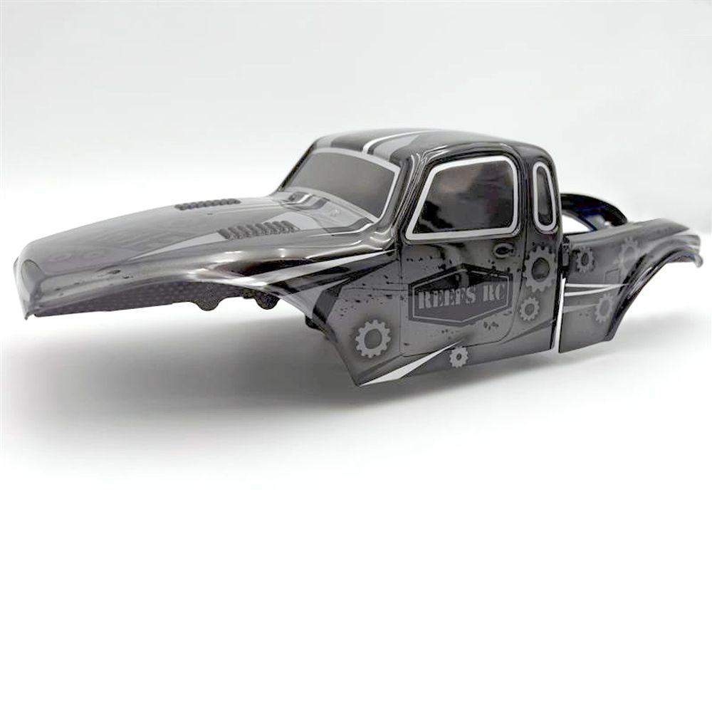 The REEFS RC "PLAGUE" 1/10th Crawler Competition body draws inspiration from the classic work trucks of the 40's. Made from 1.2mm Polycarbonate material, the durable body is designed with performance and recovery in mind. The long, rounded hood and smoothly contoured cab are key features that enhance the body's ability to recover if you end up on your roof. This versatile body set can be customized to fit your style. It can be used in a cab-only configuration, or you can attach the included rounded bed sides to further improve the likelihood of self-recovery (custom mounting required and not included).*Images shown with painted body for display only. Body requires painting and trimming.Includes:The "Plague" CabOptional left and right rear fendersReef's Sticker SheetWindow mask