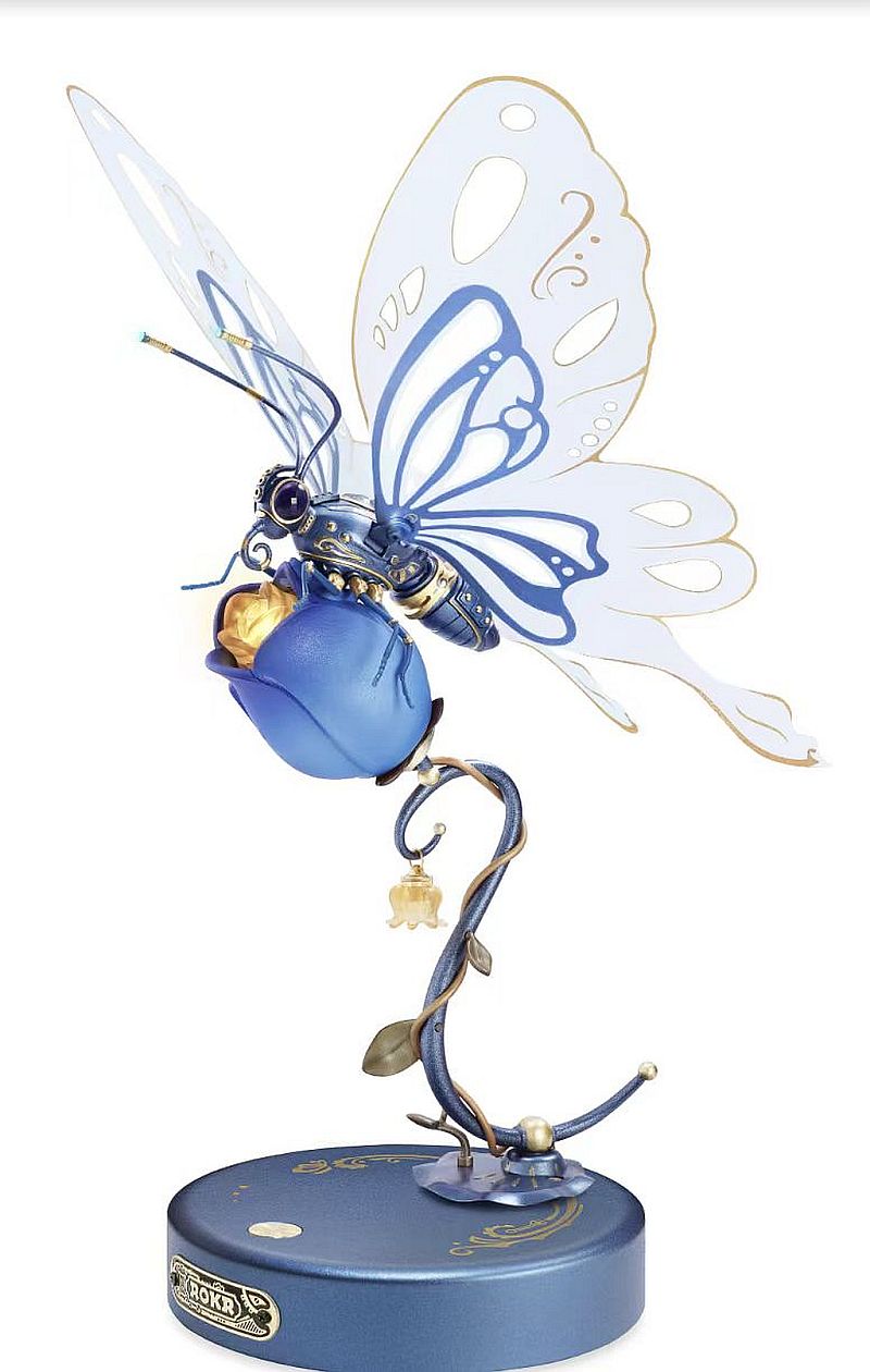 Mysterious butterflies have experienced a magical mechanical evolution! Mechanized bodies means to face more difficulties and challenges.Nature is full of mysterious beauty. ROKR will turn its attention to the light and beautiful butterflies, bringing you a new mechanical species- ROKR Mechanical Species Butterfly. The butterfly has two cool looks: MI05P and MI05B. One is a mysterious and elegant starry blue; the other is mostly rose pink, giving off a warm and gentle feeling. The butterfly's body is made tough with a material called ABS, and its soft, glittery wings are crafted from flexible PVC. They added fancy champagne-colored patterns using a special printing method, and there's even a sparkly gem on its back, shining in the sunlight. The butterfly lands on a rose twist with vines.Put the butterfly on its base, switch it on, and touch it to watch the wings flap. As the frequency changes, the rose and antennae light up a bit, like they're breathing and coming to life, sparkling in the sunlight.Bionic Butterfly WingsWings flap through regular connecting rods transmissionGolden Lighting Rose Flickering AntennaeBy combining together, they display the wonder of biological evolutionExquisite Biological TextureDisplay lifelike details with delicate patterns achieved through pad printingDesigner's JourneyIn the long journey of transformation in the steam world, even the weak tiny butterflies have embarked on the path of evolution. Influenced by steam magic, they have become mechanical butterflies. These butterflies look delicate and elegant, like treasures from nature. Inside, there's a precise and mysterious mechanical structure. They flap wings like dancers slowly coming closer. It's like a mix of nature's beauty and mechanical magic, making these butterflies a wonder in the evolving world of steam.