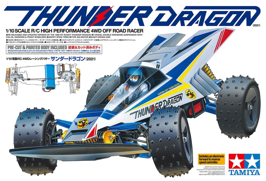 This is a re-issue of the classic Thunder Dragon buggy originally released in 1988. The classic buggy utilizes shaft-driven 4WD and smooth, ground hugging suspension providing a super-fun driving experience. The stylish Thunder Dragon body which appeared in a classic R/C comic in Japan, is an exciting re-release for R/C fans of all ages and abilities.- 1/10 scale R/C model assembly kit. Length: 390mm, width: 240mm, height: 130mm. Wheelbase: 260mm.- The chassis is based around an ABS plastic bathtub frame for excellent durability and ease of maintenance.- 4-wheel double wishbone suspension uses CVA oil shock-dampers and a front stabilizer for a superior ride.- Features shaft-driven 4WD with front and rear die-cast 3-bevel differentials for smooth, superior handling feel.- Semi-pneumatic spike tires give great grip, and are paired with large-diameter ABS wheels.- Thunder Dragon body is molded in polycarbonate, with non-canopy sections pre-painted in silver. It is pre-cut for convenience.- Includes HobbyWing THW 1060 Brushed Motor ESC (2-3S)- Includes 540 brushed type motor.- Requires: 2-channel radio, steering servo, 7.2-7.4volt battery pack and compatible charger.