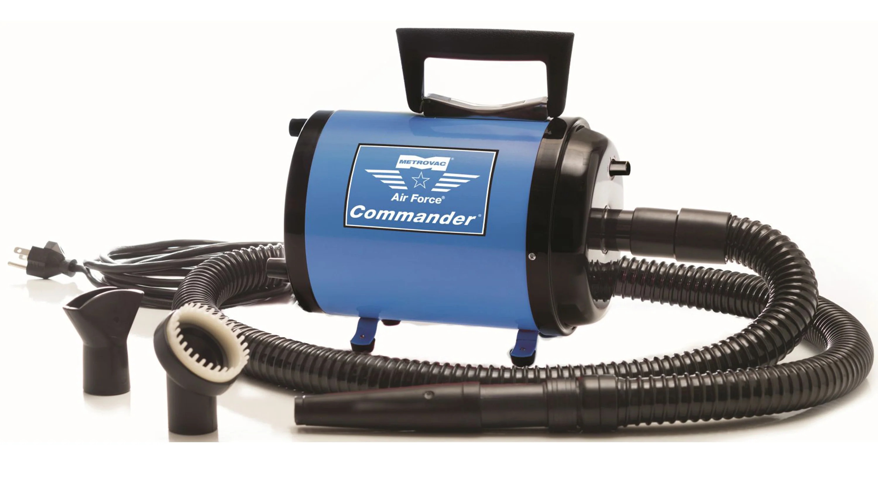 Product Description AFTD-2B: AIR FORCE COMMANDER TWO SPEED DRYER - BLUE Two Speed 1.7 Peak H.P. Floor/Table Power Unit. 6 FT. Flexible Hose w/Air flow Control, Air Concentrator, Air Flare, Groomer Rake.