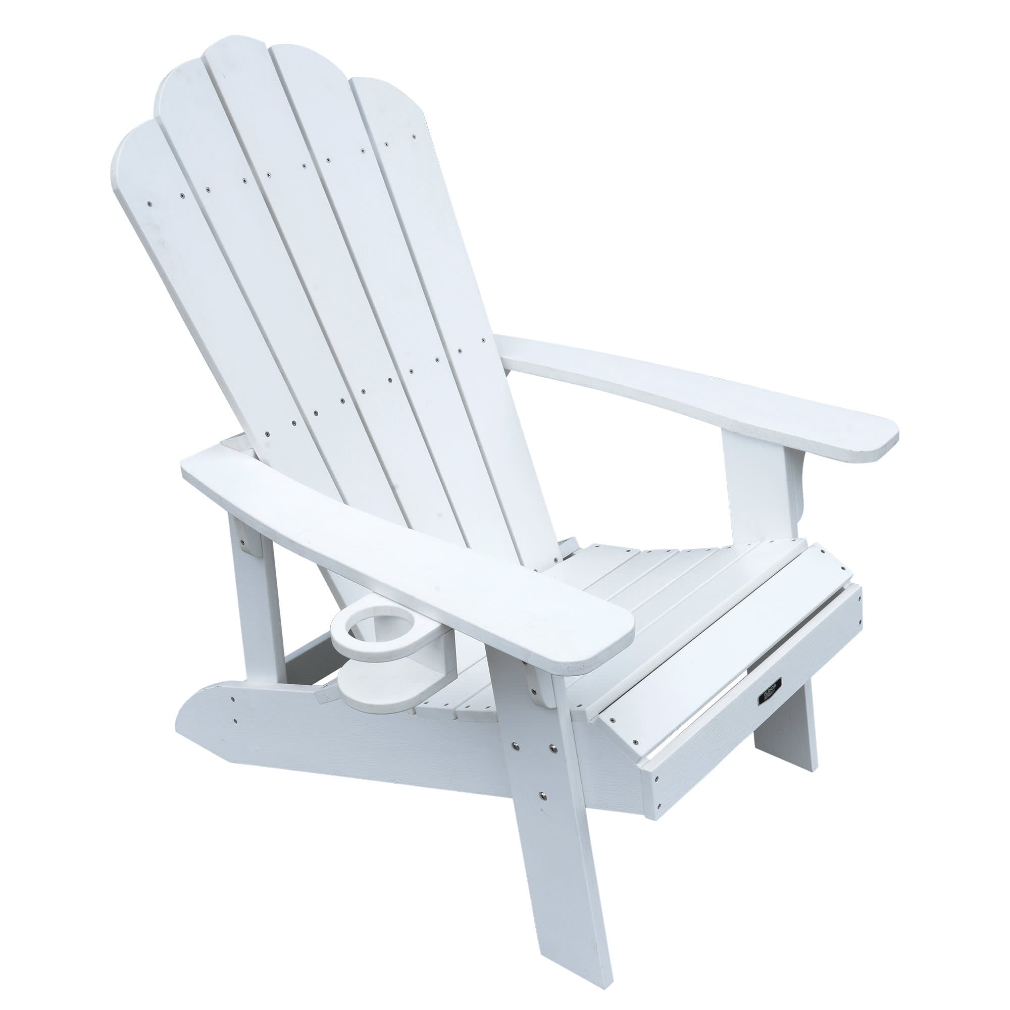 Bring a fresh look to your patio or deck with this stylish, durable chair. The quintessential outdoor seating solution, this Adirondack chair has been designed for comfort. Enjoy wide arm rests, an ergonomic high back curved seat and of course, a cup holder. Add in its fade-resistant color, and you have a handsome centerpiece for your patio, yard or porch. Engineered for outdoor living, this weather-resistant chair stands up to sun, rain, snow and ice. Plus, it's easy to clean with simple soap and water. A no-fuss, comfy chair that's perfect for relaxation and a little you-time.Features