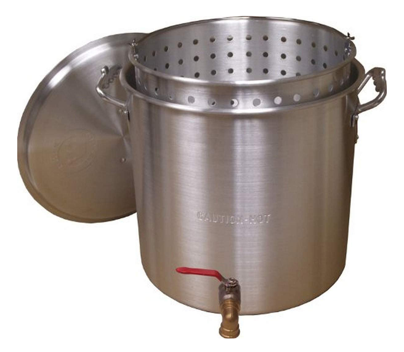 Aluminum boiling pot with drain spigot, lid & basket. Sizes: 120 qt. Boil all your favorites in large quantities! Remove easily from the pot with the strainer basket. Easy draining of liquid and cleanup with the lever handled Valve. Let's you eat like a king!