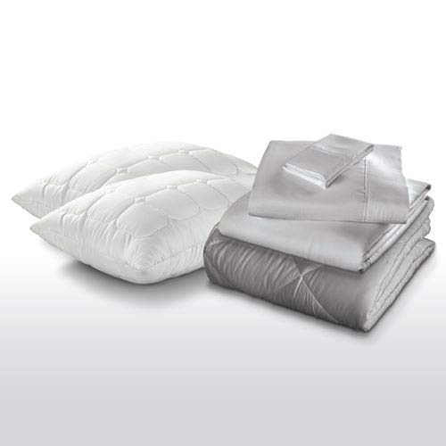 Easy and convenient, our Sleep Kit provides all of your bedding basics in one simple pack: Premium Microfiber Comforter: - Soft feel & finish provides a premium, quality sleep surface - Breathable twill weave helps keep the sleep surface cool - Wrinkle-resistant fabric provides a smooth, beautiful finish - Features a diamond pattern and piping details for a clean, crisp look and superior construction Prima Plush Pillows: - Premium fiber fill provides soft comfort - Allows air to flow through the pillow, offering temperature control throughout the night - Ultra-soft quilted cover features a satin piping detail Premium Microfiber Sheet Set: - Ultra-soft feel & finish provides a premium, quality sleep surface - Breathable extra-fine twill weave helps keep the sleep surface cool - Wrinkle-resistant fabric provides a smooth, beautiful finish - Pocketed Precision-Fit™ corners and simple elastic band provide a clean, crisp fit on fitted sheet - Enveloping pillowcases allow you to tuck your pillows into each case - Additional 4" flat sheet width for complete coverageFeatures