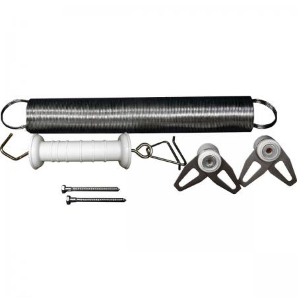 24 spring gate, is excellent for electrically bridging wide gate openings. Contracts to 32 when open and includes the heavy duty Safe-Fence Barrel and lag bolt insulator with stainless steel gate hook plates to attach the spring to any type of electric fence system.