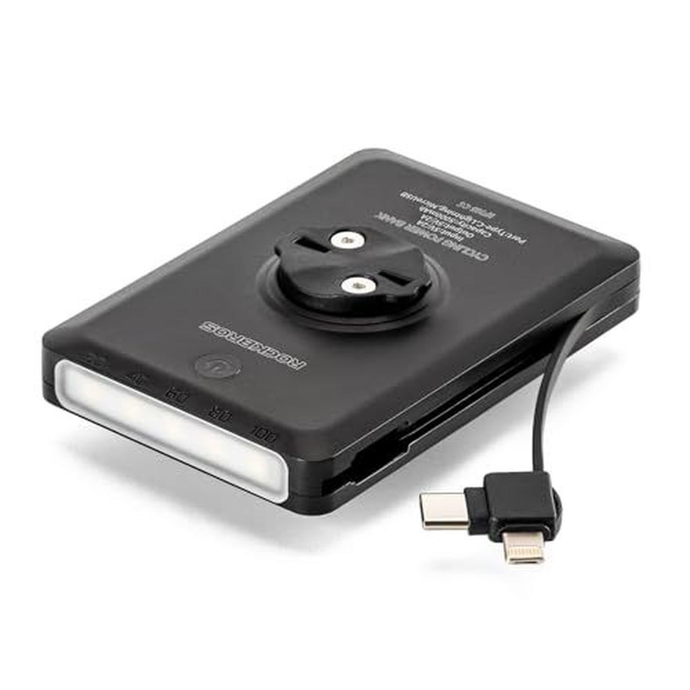 Dual end mounts Top for mounting code meters, bottom for hanging bike lights. One cable fits all: Type-C, Lighting, and Micro-USB. It can charge bike lights, odometers, GOPRO, and phones, ensuring you're prepared for emergency situations. Long press for a warning light, boosting ride visibility. High light(150lm), low light(80lm), double flash, breathing flash. Up to 12 hours of use on a full charge in high-brightness. We recommend using with ROCKBROS Lights for optimal performance. Type-C cable included, charging in 3 hours, blinking during charge, steady when full. Power button shows remaining power through indicator brightness, preventing sudden power loss concerns. Weighing only 124g and boasting IPX6 waterproof rating, the PC shell is highly sealed. Make your journeys easy and burden-free! (To ensure waterproofing, securely fasten the dust cover over the charging port.) No tools are required, can be easily installed. A base on it for mounting GARMIN or other device. Also included is a hanging base to mount the bike light underneath. When used in conjunction with a GARMIN or GOPRO, it saves space and keeps your bike's handlebars tidy.
