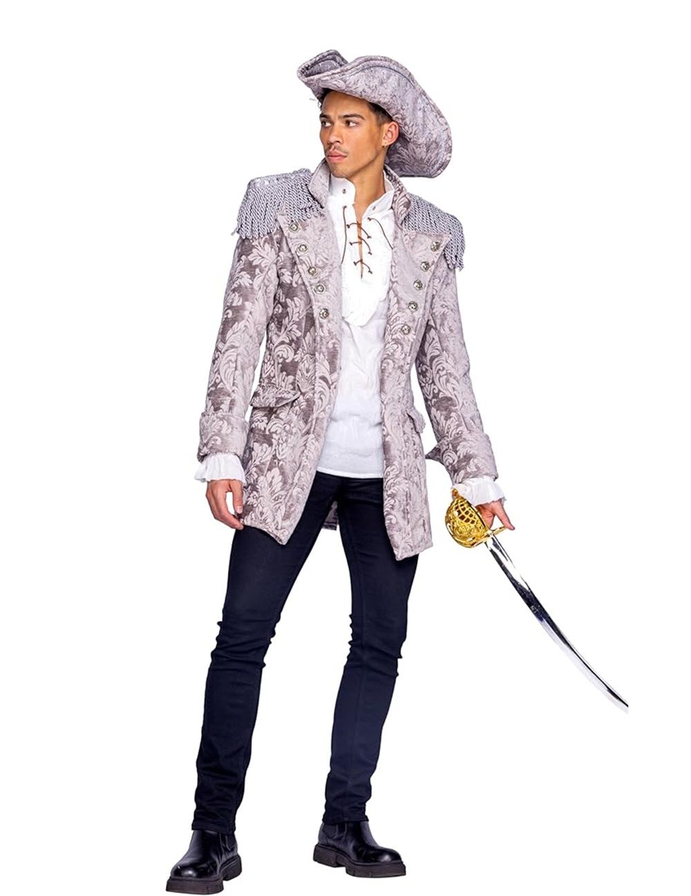 Transform into the ultimate swashbuckler with our Deluxe Pirate King Halloween Costume! This lavish ensemble features an embossed coat adorned with fringe tassels and intricate button details, perfectly complemented by a commanding pirate hat. Rule the high seas in style this Halloween!- Mens 2pc Deluxe Pirate King