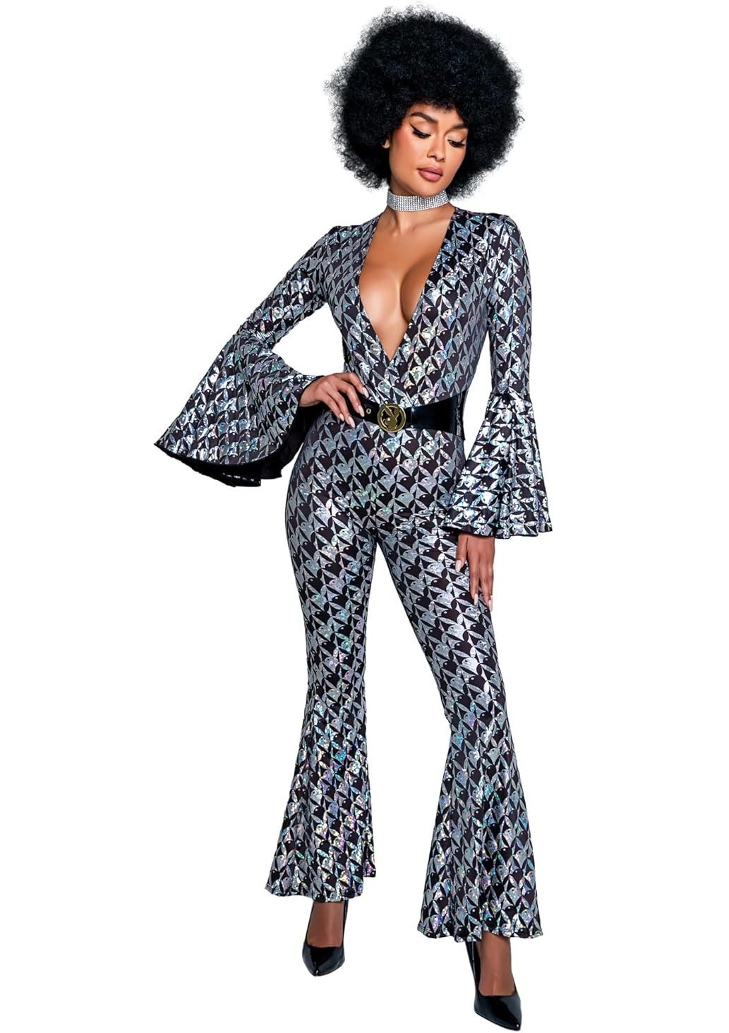 The Playboy x Roma Women's Licensed 1pc Playboy Disco Fever Halloween Costume is a stunning choice for a bold, glamorous look. This costume features a long-sleeve bodysuit with bell sleeves and bell legs, complemented by a daring low plunge neckline. The bodysuit is adorned with an all-over holographic rabbit head print and an attached faux vinyl belt to showcase that iconic Saturday Night Fever style.