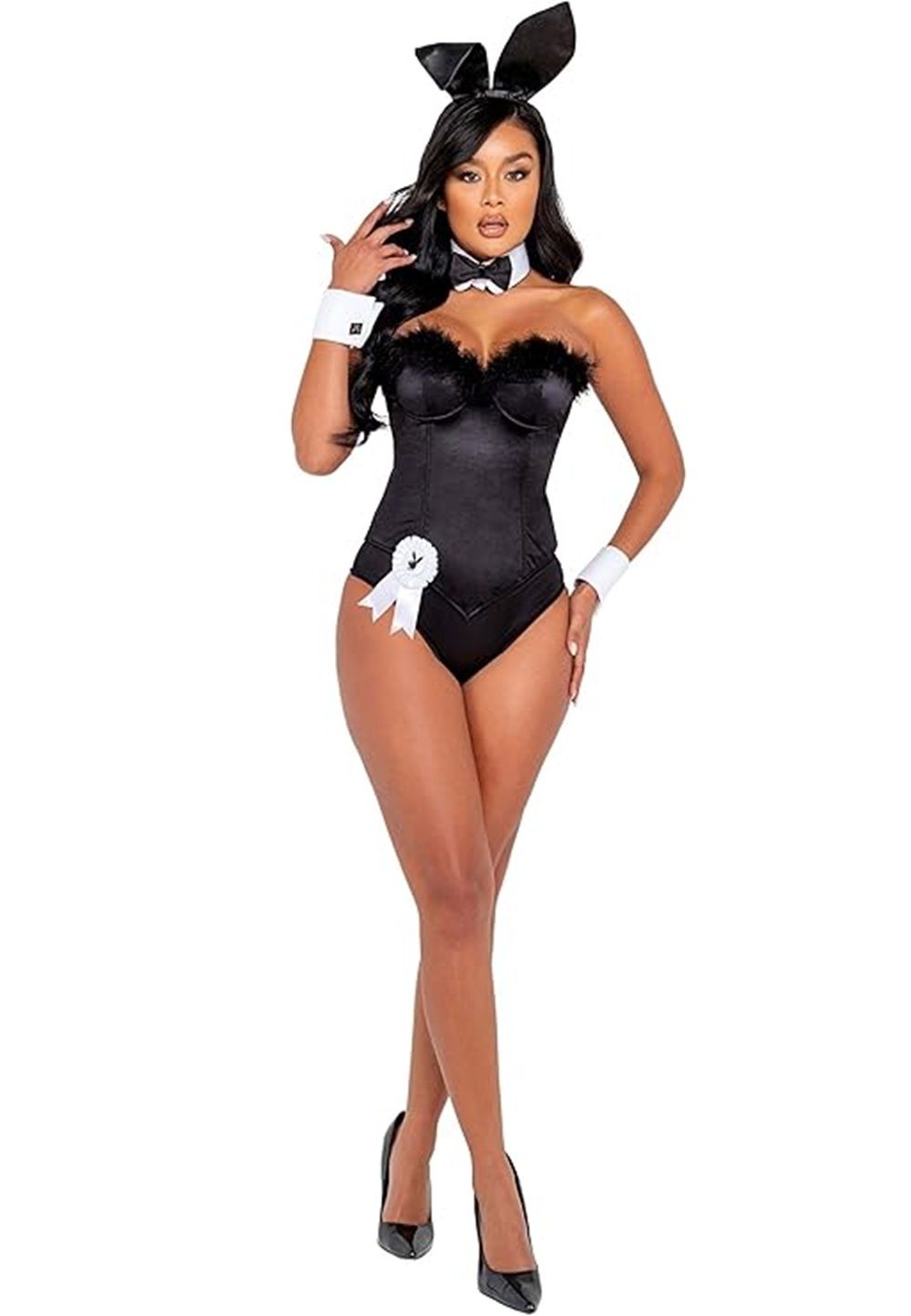 Includes Bustier with Marabou Trim, Panty, Ribbon, Tail, Cuffs, Cufflinks, Collar, Bow Tie, & Bunny Ears- Strapless bustier has separating back zipper, marabou feather edging at top of bustline