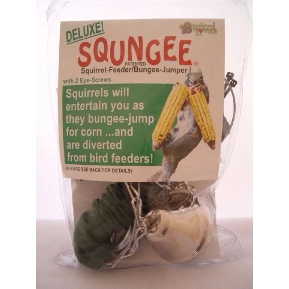 - Offers hours of entertainment!- Watch as a squirrel jumps on the corn, then as they hold on to the cob and the spring, their weight causes them to bounce and swing back and forth and up and down approximately 12 to 18 inches while pulling out kernels.- Features a strong metal wire with two eyebolts for corn cobs. An upper portion of the cord features a tight spring, covered in fabric to protect squirrels’ toes.- The construction features weather and squirrel tooth proof metal that will last for years to come.