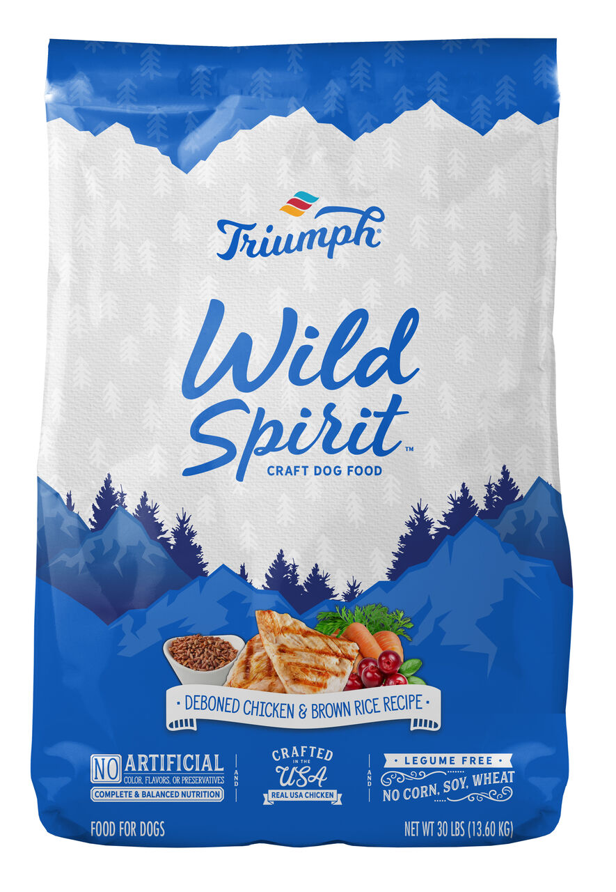 Feed your dog’s natural Wild Spirit with Triumph Wild Spirit Deboned Chicken & Brown Rice Recipe Dog Food. Our recipes are made with some of nature’s best ingredients, without any artificial colors, flavors, or preservatives. This legume free recipe is made in the USA using real farm raised cage-free chicken, which appeals to your dog’s natural ancestral instincts and true cravings. When combined with select vegetables, vitamins, and minerals, our Triumph Wild Spirit Deboned Chicken & Brown Rice Recipe Dog Food delivers powerful nutrients that help support a healthy immune system and help support overall performance in normal, healthy dogs.DEBONED CHICKEN, CHICKEN MEAL, GROUND BROWN RICE, PEARLED BARLEY, OAT GROATS, RICE BRAN, CHICKEN FAT (PRESERVED WITH MIXED TOCOPHEROLS), DRIED PLAIN BEET PULP, FLAXSEED MEAL, NATURAL CHICKEN FLAVOR, MENHADEN FISH MEAL, SALT, DRIED EGG PRODUCT, POTASSIUM CHLORIDE, YUCCA SCHIDIGERA EXTRACT, DRIED KELP, DRIED CHICORY ROOT, DRIED BLUEBERRIES, DRIED CRANBERRIES, AVOCADO, DRIED APPLES, DRIED CARROTS, PARSLEY, PAPAYA, SPINACH, KALE POWDER, VITAMINS (CHOLINE CHLORIDE, VITAMIN E SUPPLEMENT, NIACIN, D-CALCIUM PANTOTHENATE, VITAMIN A SUPPLEMENT, VITAMIN D3 SUPPLEMENT, RIBOFLAVIN SUPPLEMENT, VITAMIN B12 SUPPLEMENT, PYRIDOXINE HYDROCHLORIDE [SOURCE OF VITAMIN B6], THIAMINE MONONITRATE, FOLIC ACID), MINERALS (COPPER SULFATE, MANGANESE SULFATE, ZINC SULFATE, IRON SULFATE, CALCIUM IODATE, SODIUM SELENITE), DRIED LACTOBACILLUS ACIDOPHILUS FERMENTATION PRODUCT, DRIED LACTOBACILLUS PLANTARUM FERMENTATION PRODUCT, DRIED LACTOBACILLUS REUTERI FERMENTATION PRODUCT, DRIED BIFIDOBACTERIUM ANIMALIS FERMENTATION PRODUCT, DRIED ENTEROCOCCUS FAECIUM FERMENTATION PRODUCT.Guaranteed AnalysisCRUDE PROTEIN, Minimum 25.0%CRUDE FAT, Minimum 15.0%CRUDE FIBER, Maximum 4.0%MOISTURE, Maximum 12.0%LINOLEIC ACID, Minimum 3.0%CALCIUM, Minimum 1.2%PHOSPHORUS, Minimum 1.0%ZINC, Minimum 150 mg/kgSELENIUM, Minimum 0.4 mg/kgVITAMIN A, Minimum 13,000